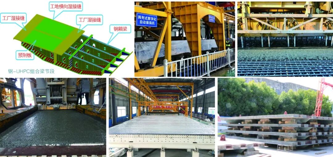 图 5 南京长江五桥钢-UHPC组合梁示意图、UHPC桥面板预制生产线(中交二航提供照片)